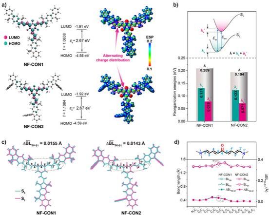 与传统的稠环多环芳烃骨架不同,该研究团队设计了一种新型非稠环羰基/氮共轭二烯骨架,在电子缺陷的C=O基团和电子富集的N原子之间插入两个共轭C=C键。理论计算表明,这种非共轭骨架的能隙(1.97 eV)显著低于传统稠环骨架(4.06 eV),为实现红移发光奠定了基础。同时,C=O和N原子的相反电子效应诱导了最高占据分子轨道(HOMO)和最低未占分子轨道(LUMO)沿二烯骨架实现原子级交替分布,保持了短程电荷转移特性,从而实现了窄谱带发光和热激活延迟荧光效应。研究团队合成了两种新型化合物NF-CON1和NF-CON2,它们均包含一个C=O环己烷-1,3,5-三酮单元和三个N原子单元,通过共轭二烯骨架连接。其中NF-CON2引入了立体螺旋二芴基团,有效抑制了分子间聚集和发光猝灭。