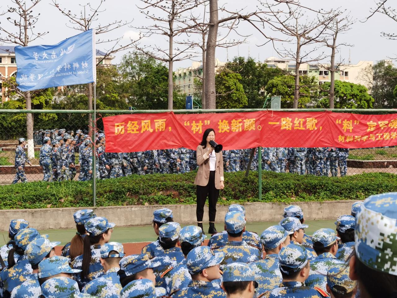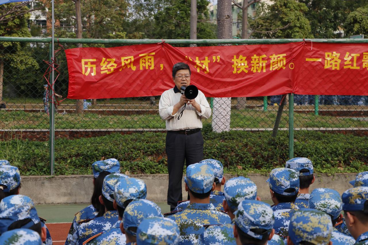 廖建和院长代表学院领导班子讲话。他指出,军训是一门课,一门磨练顽强意志、锤炼良好品质、提升学习干劲的课。军训的意义在于培养同学们的集体主义、爱国主义精神,增强同学们的国防观念以及国家安全意识。他强调,全体参训学生要积极参与军训,通过军训锻炼本领、磨炼意志,让最美的花在绿茵场上绽放。