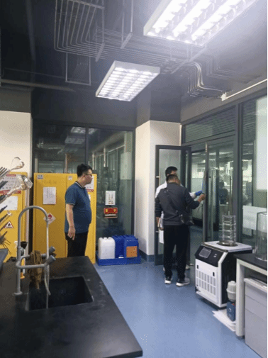 检查工作组对实验室内设施设备、器皿容器,实验室外消防、水电等情况进行逐一排查,对排查存在的问题进行记录并要求相关负责人及时整改解决。个别实验存在人员进出记录不完整、危化品使用记录不及时、工作台面不整洁等现象,胡先文书记要求各实验室要高度重视安全工作,健全规章制度,严格执行安全标准,消除安全隐患,把实验室安全和师生人身安全放在第一位,全面实行安全准入制度,不断提高师生安全意识,让安全意识入心入耳入脑,使遵守安全操作规程成为自发行为。