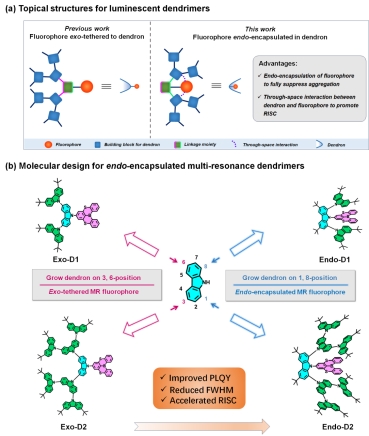 高色纯度发光材料是一类极具发展潜力的光功能材料,在半导体显示、光电传感、生物成像等领域具有重要应用前景。具有多重共振(Multiple Resonance, MR)效应的稠环芳烃荧光材料由于其分子骨架能够抑制激发态的结构弛豫,因而具有窄谱带发光特性,是发展高色纯度发光材料的重要途径。但是,MR荧光材料目前尚面临一些挑战。首先,具有平面骨架的MR荧光材料在高掺杂浓度下容易聚集,导致荧光猝灭和光谱展宽。其次,许多MR荧光材料的反向系间窜越速率偏低(kRISC:103~104 s⁻¹),限制了激子的有效利用。此外,目前大多数MR荧光材料主要采取真空沉积技术加工制备器件,而适用于低成本制造工艺的溶液加工型MR荧光材料则存在发光效率偏低的问题。