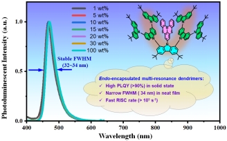 近期,千度直播 邵世洋教授团队与中科院长春应化所王利祥研究员团队合作在著名学术期刊Angew. Chem. Int. Ed.发表论文,报道了具有内封装结构的树枝状荧光材料,通过在咔唑单元的1,8-位连接生长不同代数的咔唑树枝形成一个能够容纳发光中心的空腔,使得硼/硫共振荧光单元能够被封装到树枝单元的内部。这种内封装结构能够使得发光单元彼此隔离,从而抑制高掺杂浓度下聚集引起的光谱展宽。随着掺杂浓度从1 wt%增加到100 wt%,该树枝状荧光材料具有几乎不变的窄谱带蓝光发射,半高全宽(FWHM)维持在32~34 nm。同时,这种内封装结构能够迫使咔唑树枝单元与硼/硫共振单元之间形成分子内π堆叠结构,从而诱导树枝与共振单元之间的空间相互作用,使得反向系间窜越(RISC)速率提高约4倍(kRISC ~ 4.7×10⁵ s⁻¹)。基于该树枝状荧光材料的溶液加工荧光器件表现出高效的窄谱带蓝光发射,最大外量子效率为22.6%,为目前报道的溶液加工型窄谱带蓝光材料的最高效率。