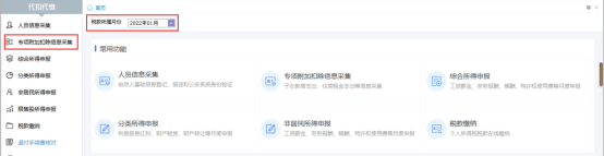 1.在扣缴端主页 ,选择正确的【税款所属月份】,点击“专项附加扣除信息采集”菜单,进入专项附加扣除信息采集页面。