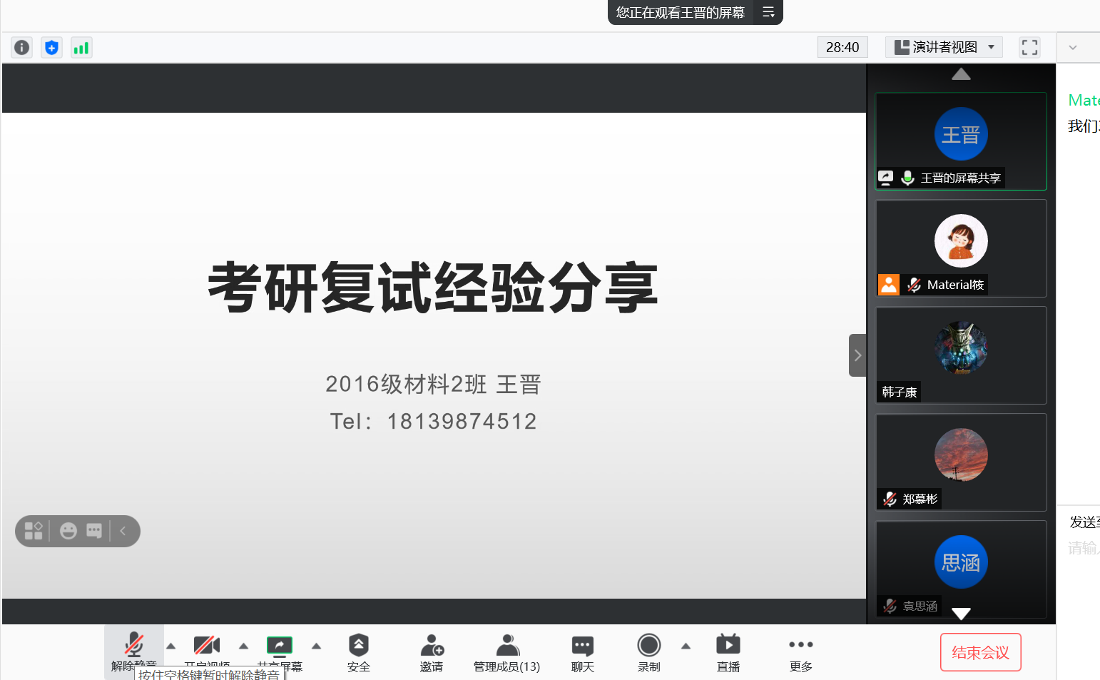 会议邀请2020届优秀毕业生现分别就读于西安理工大学的王晋、千度直播 的王贤龙、山东大学的李阳凡为2021届毕业生做考研复试经验分享交流。三位同学首先向大家讲解了复试流程、注意事项以及准备过程应注意的问题。他们指出,专业备考时,应针对所考取的院校专业考试范围,提前展开学习;在复试过程中,要注重细节,回答问题思维要缜密,表达要流畅,注重逻辑性,面对不会的问题,应实事求是,始终保持对学术的严谨性和严肃性。互动环节,同学们围绕复试流程、调剂信息、应试技巧等方面存在的疑惑积极提问,三位毕业生耐心倾听、悉心回答。