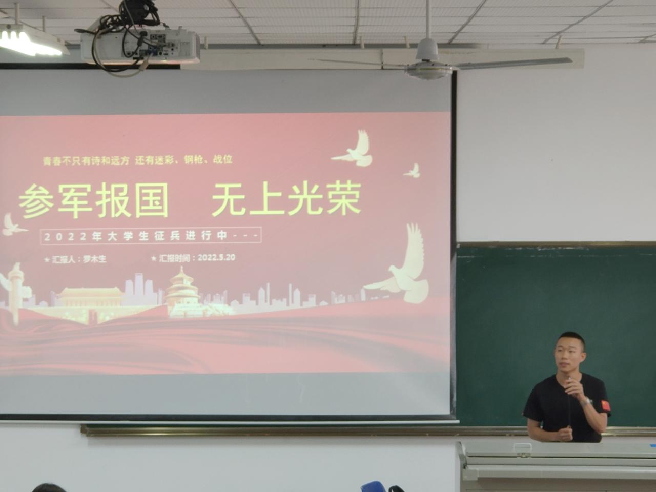 为积极响应党和国家的号召,帮助大学生深入了解应征入伍的相关政策,鼓励学院毕业生积极参军入伍,5月20日上午,千度直播 于4教101召开征兵动员大会,千度直播 学生工作部(学生工作处、人民武装部)军事科科长叶沪伟、大学生征兵宣讲团学生代表罗木生、2018级辅导员郎筱宇和全体本科毕业生参加了大会,郎筱宇主持会议。
