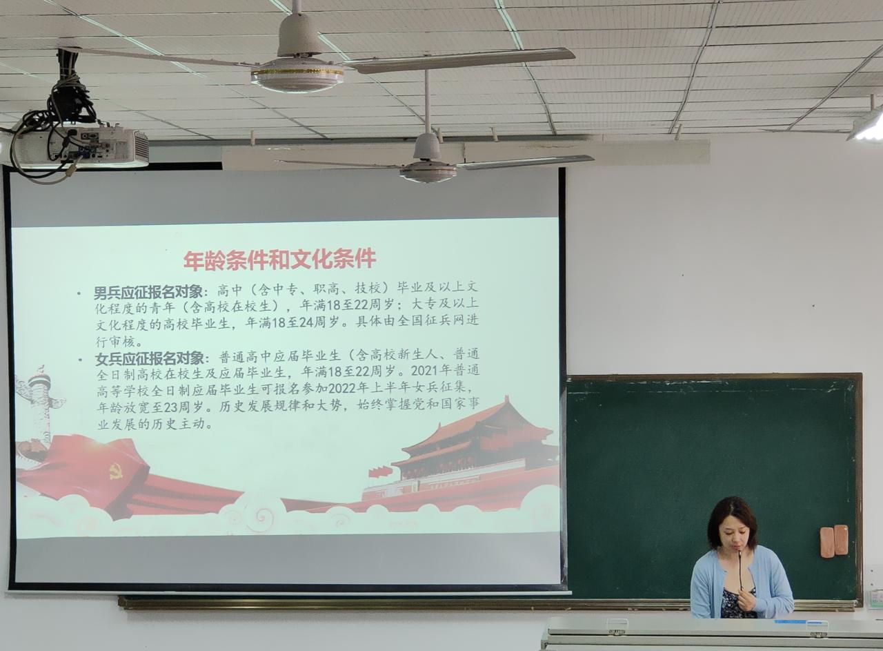 动员大会上,郎筱宇老师从征兵的范围条件、入伍的基本身体条件、征兵程序安排、报名方式、大学生应征入伍的优惠政策等方面为同学们进行了详细解读。鼓励同学们积极响应国家号召,立志献身国防事业。